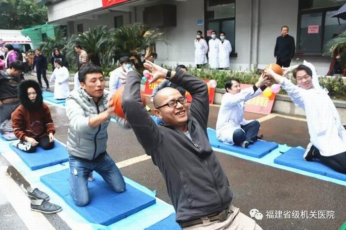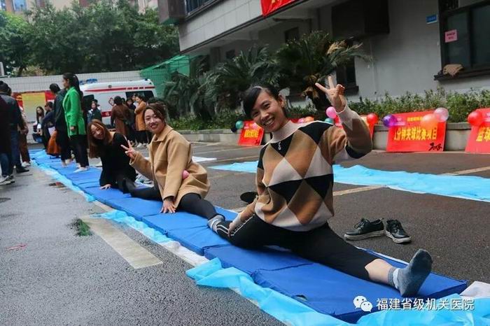 平时严谨的医务人员此刻化身矫健的运动员,展现柔软度,大秀一字马。