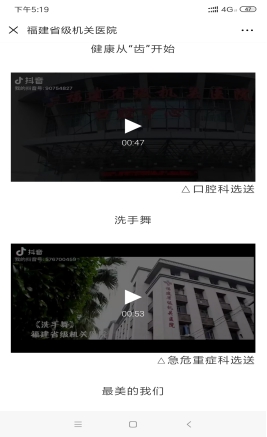 为增强护理团队的凝聚力和向心力,护理部和院团委联合举办“爱院、爱家、爱生活”抖音短视频比赛,通过抖音短视频展示护士日常工作、学习和生活的点点滴滴,展现国产自拍av护士良好的精神风貌。此次活动,外科二楼《最美的我们》被评为最具影响力奖、保健二区《护理一生,芳华依旧》、急危重症科《洗手舞》被评为最佳创意奖;体检中心《one day人员》、口腔中心《健康从齿开始》、内科一区《燃烧吧,青春--认真工作,快乐生活》被评为最佳团队奖。