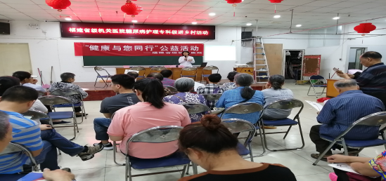 健康与您同行系列活动之一,走进福州晋安区新店镇义井村为村民带来一场特殊的健康讲座:全场用福州方言与村民交流。本次活动由院护理部糖尿病护理专科小组与院慢病管理组、院体检中 心共同承办。义井村村党委和村委会关注中老年村民的健康,每年组织大家健康体检。但在体检后,如何通过体检促进村民健康,是更为重要的问题。因此,糖尿病护理专科组提议针对团检分析为村民开展一次健康教育讲座,以提高健康意识,但是,村民们文化承度较低,大多不会听普通话,如何用通俗的语言进行讲解,让大家感兴趣、有收获。此次邀请院内分泌专家张祥捷主任进行方言讲座。范颖副主任护师现场与村民进行一对一的糖尿病相关运动、饮食方面的指导。糖专小组成员为村民进行血糖监测及血压监测。同时引导村民建立健康的生活方式,增强居民自我保健意识,并提供现场咨询等服务。共有93位中老年人前来学习健康知识。