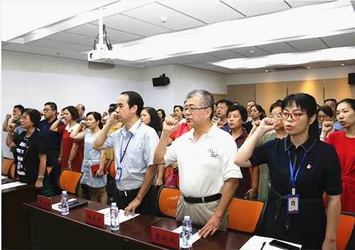 会上,党委副书记、纪委书记、副院长陈榕珍代表院党委宣读了表彰决定。2018-2019年度先进党支部、优秀共产党员、优秀党务工作者在会上受到表彰(详见名单)。3名新党员神圣举起右手,向着党旗庄严宣誓,党委书记为新党员佩戴党徽。与会老党员重温了入党誓词,