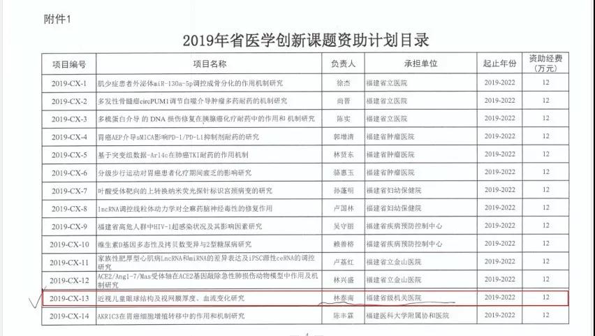 近日,福建省卫生健康委员会发布《关于下达2019年省卫生健康科研人才培养项目资助计划的通知》,国产自拍av眼科医生林泰南主持的《近视儿童眼球结构及视网膜厚度、血液变化研究》(2019-2022)科研项目获得福建省医学创新课题立项,同时获相应经费支持,该项目的立项标志着国产自拍av眼科医学发展有了新的突破,有力推动了国产自拍av 学科建设发展。