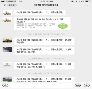 二十一世纪是个信息化、网络化的时代。信息技术的飞速发展,给知识的传播带来了生机,也给传统阅读带来了挑战。随着手机功能的提升,民众尤其是年轻人空闲时间的娱乐逐渐转移到手机,尤其是QQ、微信、视频、抖音等更是他们的娱乐首选。肿瘤专科小组利用大家对手机的“钟爱”,及手机具有携带方便的优势,将需要学习的内容发在微信中,让组员通过微信无时间要求的进行学习、交流,与传统的集中学习相比,避免了因时间冲突组员无法按时学习及花大量时间赶路、等待导致时间的浪费等缺陷,大大增加了学习的效率。