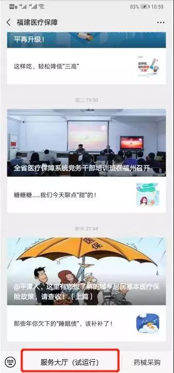 一、可通过“福建医疗保障”微信公众号菜单栏“服务大厅(试运行)”入口进入该小程序。