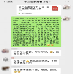 庚子年的春节,是一个无比特殊且艰难的春节,面对突如其来的新冠肺炎疫情,全国人民都投入到了新冠肺炎疫情防控工作中来。作为一名医护人员,虽不是在抗疫最前线,但我们也义不容辞,悉心照顾着住院的每位患者。以往,我们都会定期举办健康教育讲座,为患者和家属分享知识。但今年形势不同,为了做好防控工作,我们不适宜进行现场健康教育讲座。那怎么办呢?组员们想。要不,我们将宣教知识分享在家属的微信群吧。这个建议一提出,大家都积极响应。结合疫情,我们准备了简单易行的健肺呼吸操,文字配上我们自己和护理员一起示范的呼吸操图片,简单易懂,家属们反馈,真不错,简单易行好操作,而且还特别贴近当下形势。