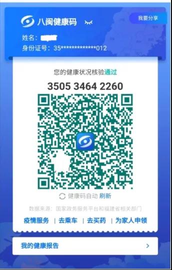 “闽政通”APP的省内外实名认证用户点击登录该服务后,无需填报任何信息,系统将自动进行后台数据核查比对,根据数据比对情况,分别生成绿色、橙色两种不同颜色的“八闽健康码”。