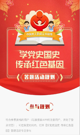 抓住各个纪念日节点和暑期、假日,积极组织青少年子女参与中国关工委组织开展的“学党史国史,传承红色基因”青少年线上答题活动,进一步在青少年中掀起学习党史国史、传承红色基因热潮,把青少年爱国主义教育推向深入。答题安排两个赛季,第一赛季从5月29日到6月19日,第二赛季从6月29日到7月19日。答题活动由中国关工委与新华社中国搜索联合举办,参与者通过手机下载花漾搜索APP参与答题。