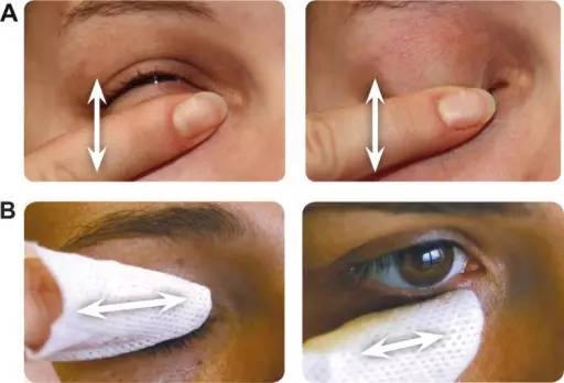 睑板腺按摩的基本步骤是:眼部点表面麻醉药后,医生捏起患者眼睑使之轻度外翻,暴露睑缘,手持表面麻醉药湿润的棉签按摩睑缘处睑结膜面,顺着睑板腺的方向按摩眼睑,排出睑板腺内的类脂质,使睑板腺开口通畅。按压后用无菌生理盐水棉签拭去分泌物。