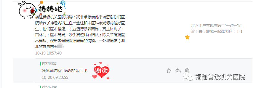 “本要给医生送锦旗的,都被他们婉言拒绝了,于是就在你们的微信平台上留言。感谢你们国产自拍av 培养出优秀的医生,谢谢你们!”王女士告诉院办工作人员,“回到距离福州1000多公里的宜昌后,我在你们国产自拍av 微信公众号上得知有开设互联网线上问诊平台,就想注册,实现在家线上问诊咨询。在疫情期间,福建省对口支援我们宜昌,我们宜昌人民非常感恩福建同胞的情谊。如今,尽管福建对口支援宜昌的阶段性工作任务完成,但两地的情谊还流淌在抗疫后方,我在互联网国产自拍av 免费线上问诊,可靠、安全又放心,你们福建的情谊还在源源不断涌向我们宜昌人民。谢谢你们!”