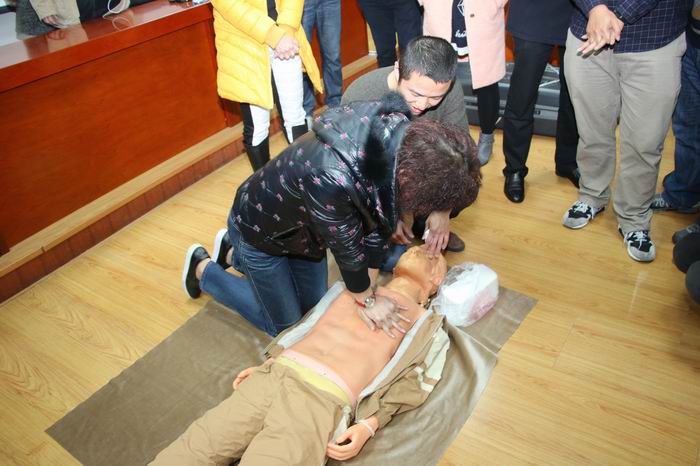 黄钒主治医师通过人体模型亲身示范,帮助大家领会心肺复苏的胸外按压和人工呼吸的操作方法,使大家更直观的掌握急救技能。