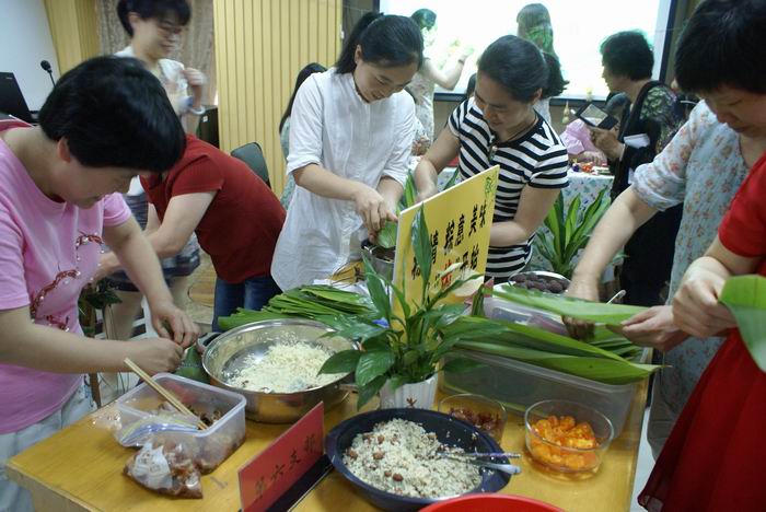 活动现场弥漫着浓浓的节日气氛。包粽子比赛区,来自各个党支部的职工代表参与热情高涨,参赛选手们分工明确,一会儿功夫一个个饱满的粽子逐渐成型,场边的观众也在比赛队伍中来回穿梭,在给自己队伍加油的同时,也不时“侦察敌情”。伴着明快的音乐节奏,不多时,退休老干部代表队就最先包好30个粽子,获得本次比赛的胜利。手工DIY香囊、蛋篓区,弥漫着温馨、幸福的味道,姐妹们欢声笑语,穿针引线,在一针一线中体验端午习俗风情及其所蕴含的文化内涵,也表达了对传统文化的敬仰。