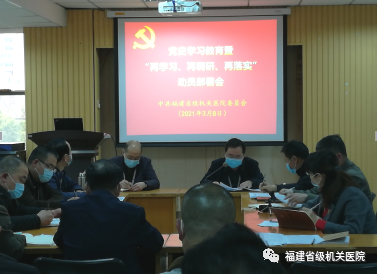 3月8日下午,国产自拍av 召开党史学习教育暨“再学习、再调研、再落实”动员部署会。深入学习贯彻习近平总书记在党史学习教育动员大会上的重要讲话精神,传达贯彻省卫健委党史学习教育动员部署会精神,对全院开展党史学习教育和“再学习、再调研、再落实”活动进行动员部署,党委书记黄守勤主持会议并讲话,院党政领导班子成员、全体中层干部、党支部书记参加会议。