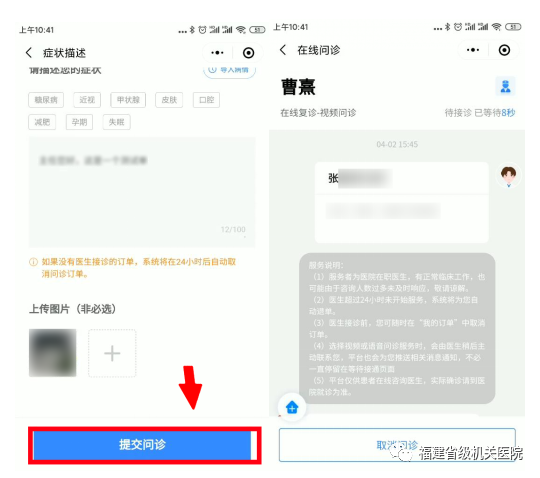 根据自身情况,进行症状描述后提交问诊,之后等待医生接诊。