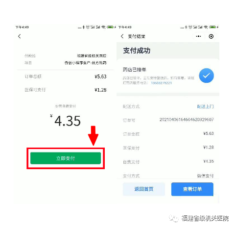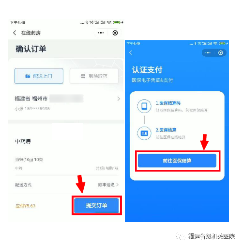 人脸识别通过后,点击“提交订单”,选择“前往医保结算”,并点击“立即支付”,之后即可成功完成医保在线结算。