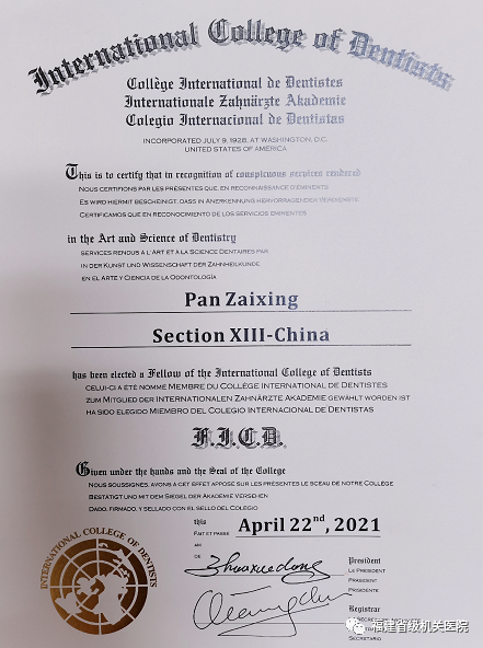 国际牙医师学院于1920年成立,今年为第101届,中国于1928年成立。这一权威组织由全球在口腔医学领域取得杰出成就和优良服务的最优秀的牙医精英组成,是世界牙医学方面杰出贡献者的最高荣誉专业评价机构。国际牙医师学院院士称号被业界认为是“全世界牙医师最高荣誉称号”。