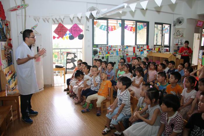 “如果小朋友每天吵闹着要一直看电视,以后就会向叔叔一样戴眼镜咯!所以每天看动画片的时间不能超过半小时,比如看大家喜欢看的《小猪佩奇》动画片,最多只能看两集,知道了吗?”林泰南十分生动活泼的“儿语”让小朋友一下就接受了浅显易懂的爱眼知识,教室里不时传出孩子们齐声回答的稚嫩童声。