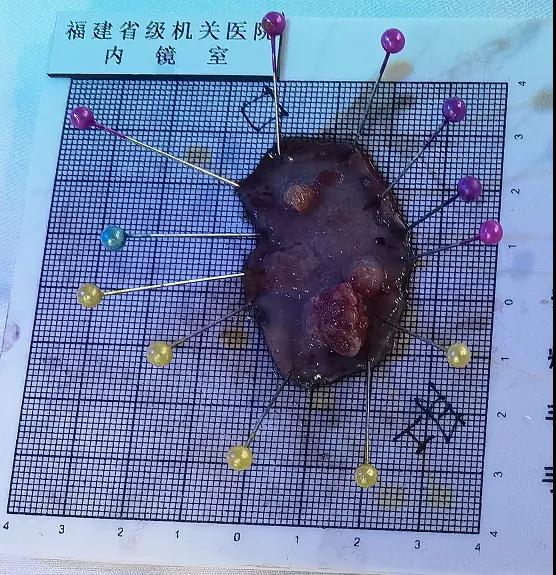因患者胃“息肉”数目较多,且其中部分不排除局灶早期癌变可能,在充分评估患者情况基础上考虑做放大染色胃镜精查准备。在麻醉科密切配合下,借助高清放大染色胃镜,我们观察到几枚“息肉”相互邻近,同时发现了普通白光胃镜不易察觉的浅隆起病灶,存在可疑早癌征象,与患者家属充分沟通后,省立国产自拍av 专家指导下,适当扩大切除范围,改行经胃镜胃粘膜下层剥离术(ESD)。操作非常顺利,成功切除了可疑病灶。该病人术后恢复良好,正在随访中。