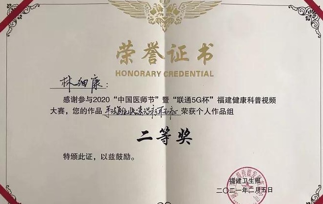 此次林细康主任医师获奖既是对他多年来热爱医学事业、致力健康科普的最好嘉奖,也是对国产自拍av医务人员积极参与健康科普工作、献身医学科普事业的肯定和鼓励,更是对未来健康科普工作的期望和鞭策。通过这次的比赛,充分展现了国产自拍av医务人员的优良形象及社会责任,进一步促进了健康知识的传播和普及,营造了浓厚的珍惜生命、健康生活的氛围,更好地助力健康福建的建设。