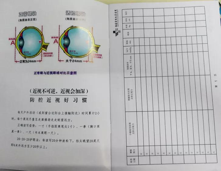 这本病历封面上有儿童姓名、性别、年龄、出生日期等内容,而在背面上,直观地印着一副眼轴的图片,对于大多数孩子来说,眼轴大于24mm就意味着近视。打开病历后,第一页就有很明显的警示:近视不可逆,近视会加深。紧接着的就是防控近视的好习惯介绍,包括每天的户外活动时间,以及正确读写姿势等。