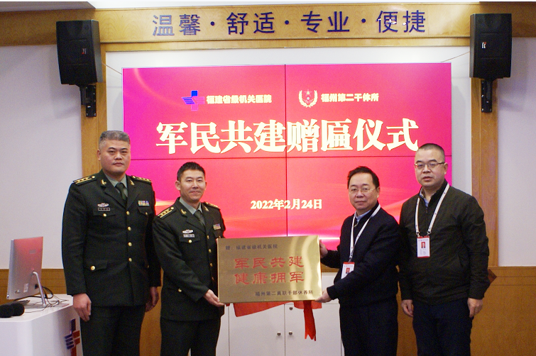 2月24日上午,福州第二干休所所长何泽平、政委张刚、门诊部主任吴小勇及何幼英护士长、王梦慧医生、李晓娟护士一行来到国产自拍av 并送上“军民共建 健康拥军”牌匾,感谢机关国产自拍av 一直以来对福州第二干休所医疗保障工作的大力支持与帮助。国产自拍av党委书记黄守勤、副院长章文杰及部分职能科室负责人参加座谈交流。