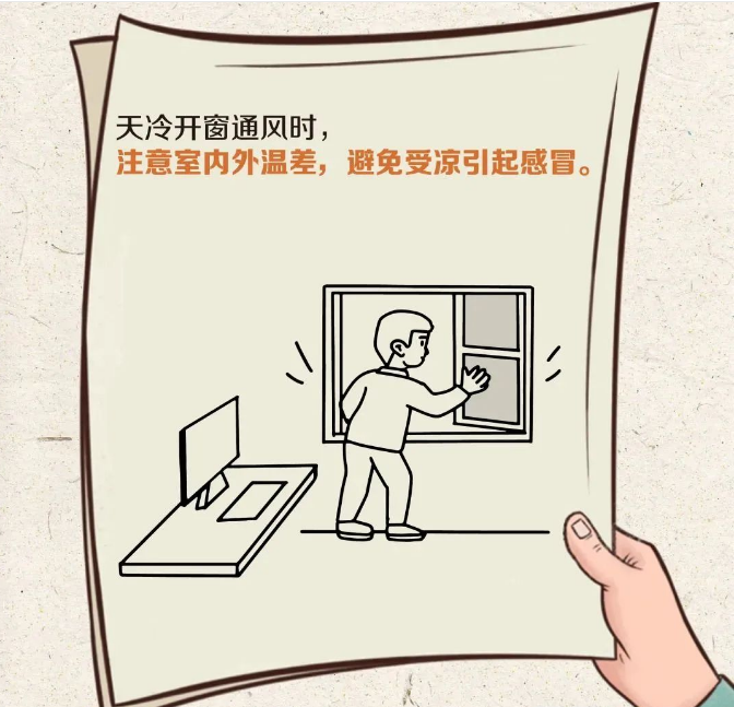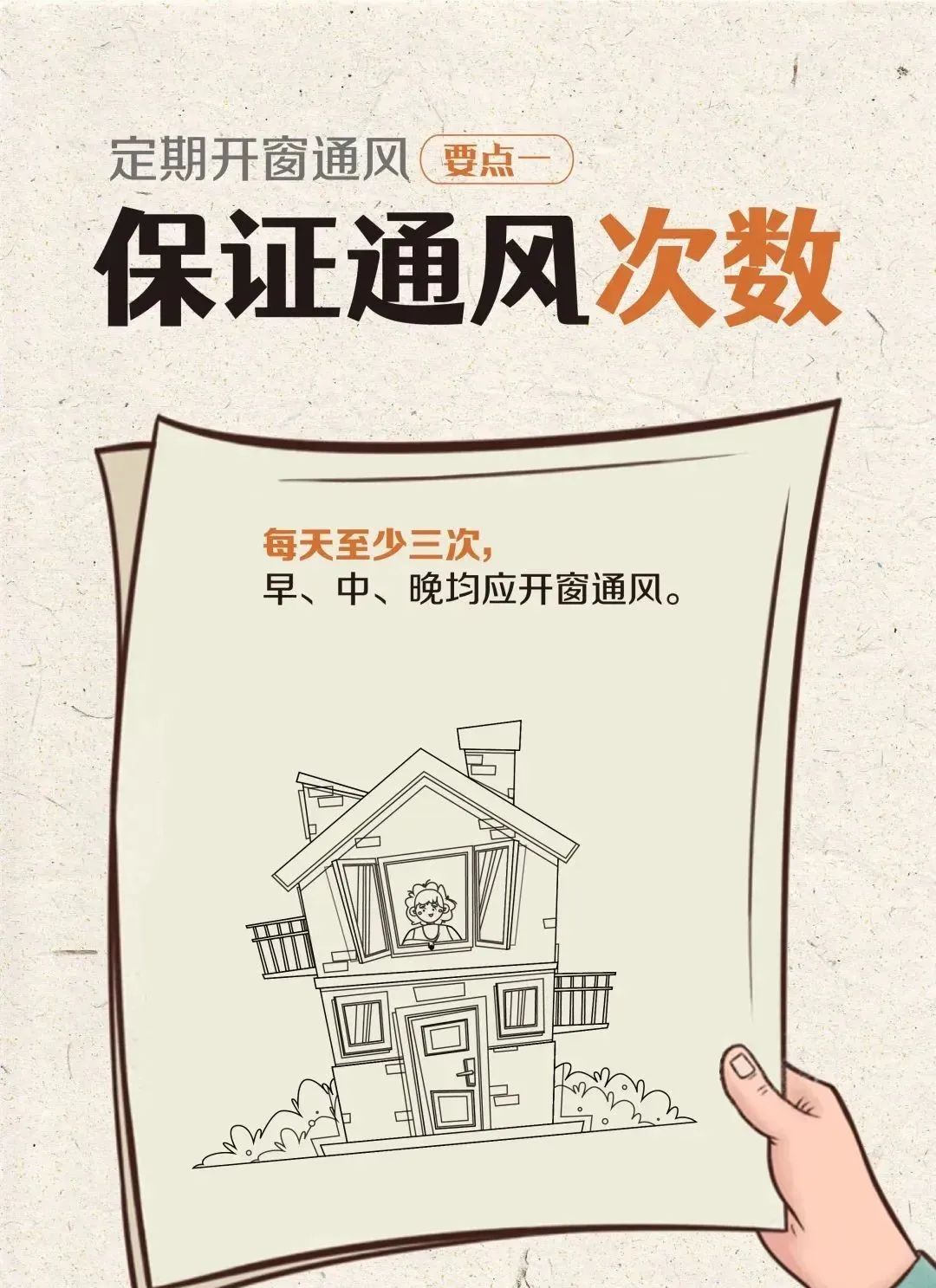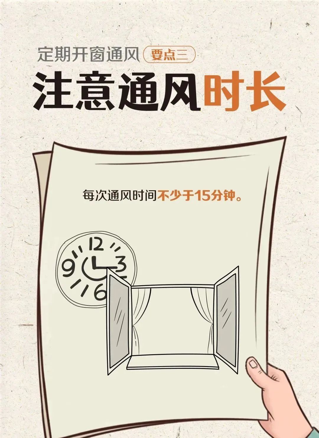 即使天气寒冷也要坚持开窗通风,每天2-3次,每次10-20分钟,使室内空气流动,可以同时打开门窗或多扇窗户形成对流,也可以使所有房间逐一通风;家中有居家隔离人员时,其所在房间应关闭房门,单独开窗通风;开窗通风时要注意防寒保暖,尤其是家中有老人、孩子等抵抗力较弱人群更应做好保暖防护,以免着凉。