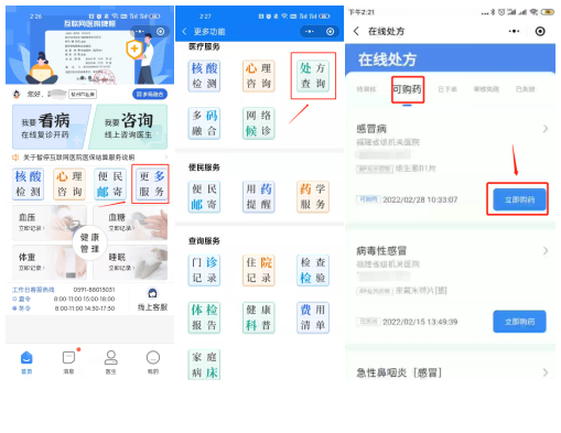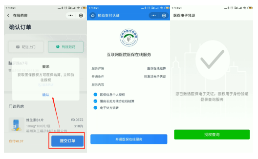 问诊结束后,市民可点击“更多服务”—“处方查询”,选择待结算处方订单。点击“立即购药”,确认“配送上门”或“到院取药”配送方式,点击“提交订单”。之后,确认医保授权,选择“开通医保在线服务”。