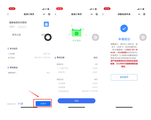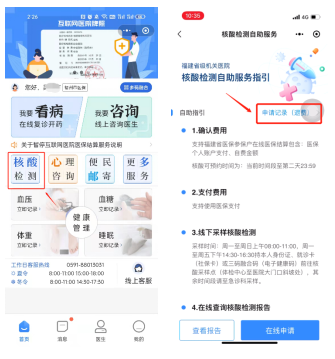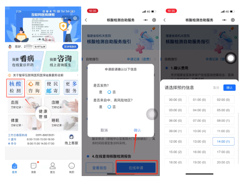通过“核酸检测”进入核酸申请页,点击“在线申请”并确认申请信息。选择预约检测时间,点击“去支付”并完成支付。之后,即可按照预约时间前往国产自拍av 进行核酸检测。