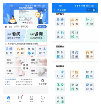 点击“更多服务”,即可进入更多功能页,含处方查询、门诊记录、住院记录、报告查询、家庭病床等功能,可根据自身需求选择相应的医疗服务。