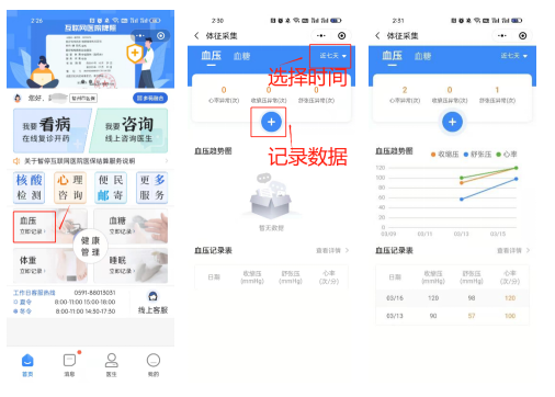 可在国产自拍av“健康管理”处,选择血压、血糖、体重或睡眠,进入相关的数据采集界面,之后记录数据,平台将根据上传数据,生成相应的体征趋势图。