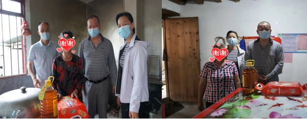义诊结束后,支部书记张志民、高云带领党团员代表走访慰问三户村里贫困家庭,为他们送上油、米等慰问品。