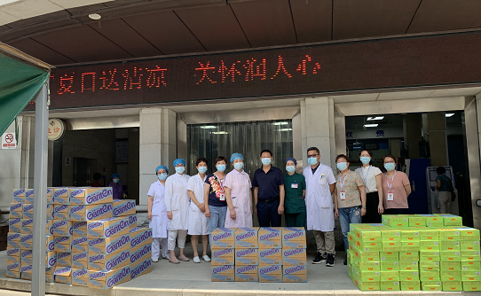 党委副书记、工会主席黄纯为仍然奋战在高温一线的门诊预检分诊点、核酸检测点、保安保洁和护送标本的工作人员送上防暑降温慰问品。