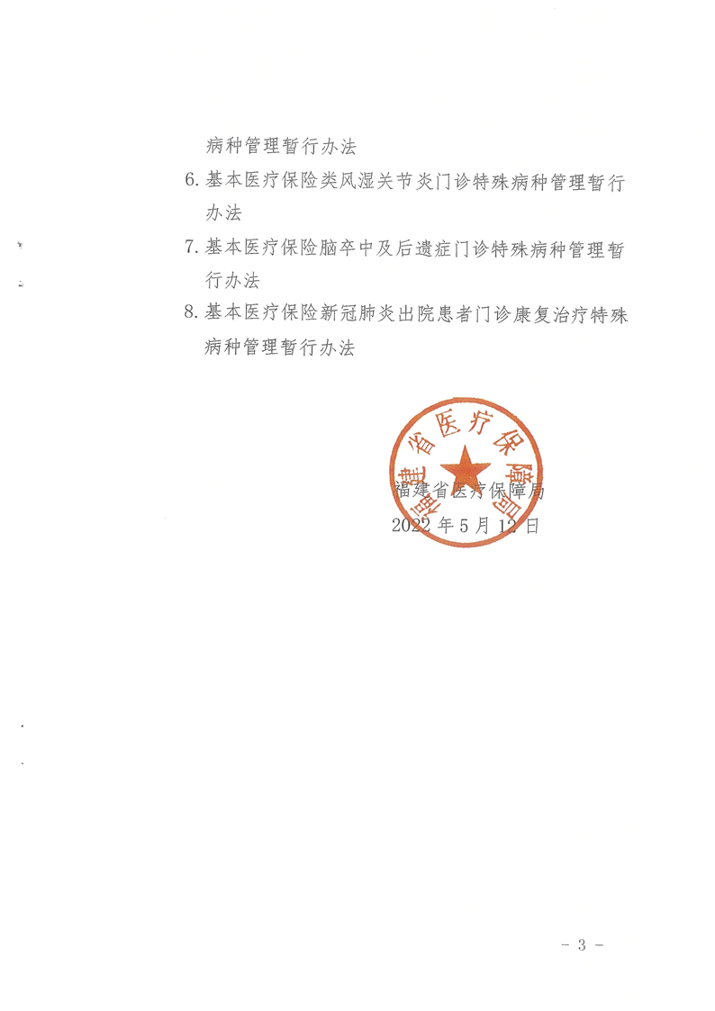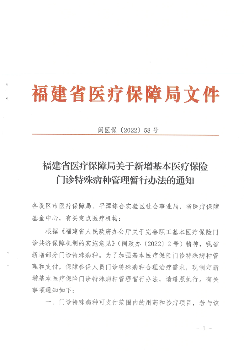 闽医保〔2022〕58号--福建省医疗保障局关于新增基本医疗保险门诊特殊病种管理暂行办法的通知
