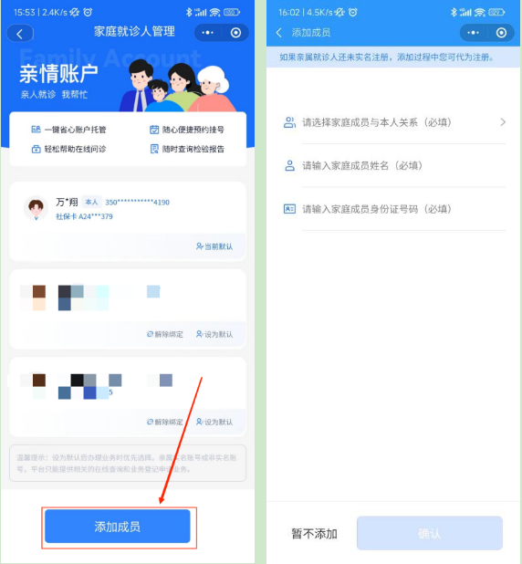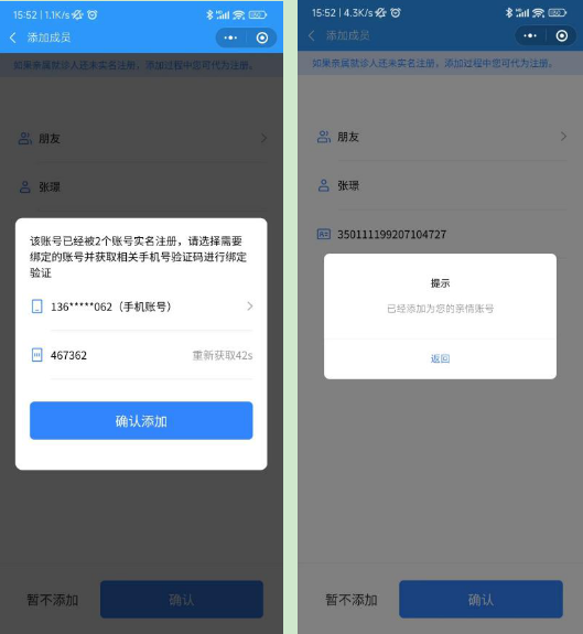 2.根据提示选择亲情关系,填写对应的人员信息(姓名、身份证号),系统校验填写的信息的准确性,并查询该用户是否已建档;