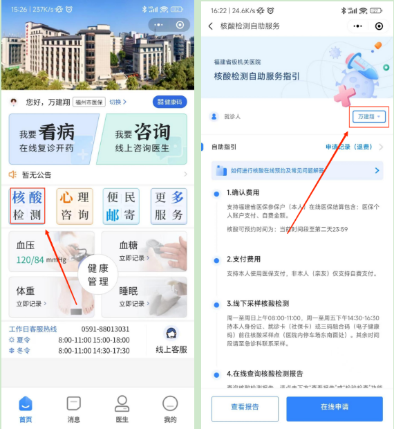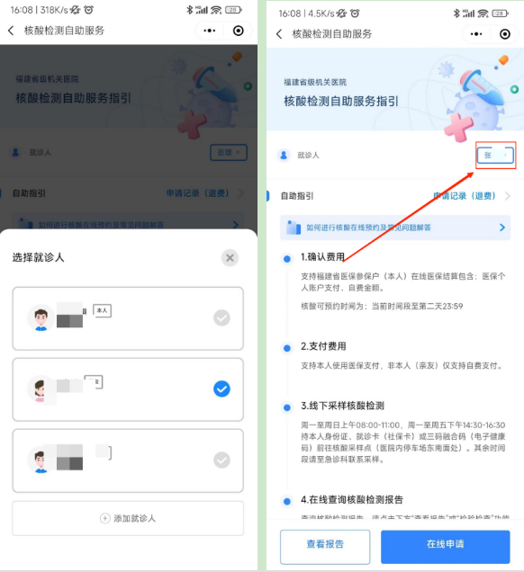 1.点击国产自拍av”核酸检测”进入核酸检测预约页面,点击页面右上方“就诊人”弹窗选择就诊人;