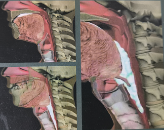 福州的程阿姨(化名)因脑梗死后肺部感染,长期留置鼻肠管,饮水呛咳,行反复唾液吞咽测试(RSST)30秒内完成1次,饮水试验4级,容积粘度吞咽测试(VVST)3ml中稠食物即出现呛咳,血氧饱和度下降,音质变化等安全性问题;颜面口肌功能方面较差,流涎,食物含在口腔溢出,查体舌各向运动差,抗阻不能,咽壁感觉差,咽反射弱。