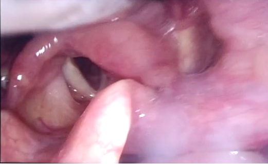 图为吞食绿染液体后,喉内镜下显示,会厌谷、梨状窦无绿染色液体残留,无渗漏,无误吸。