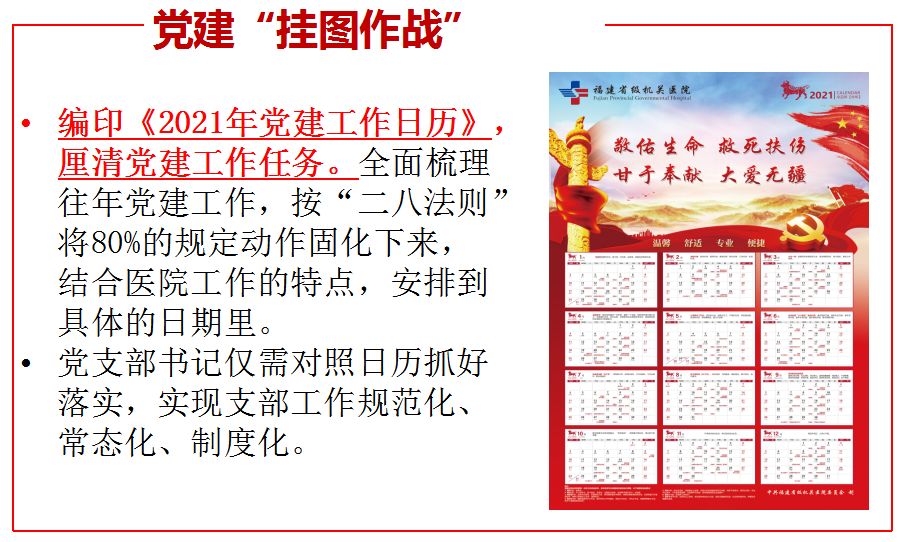 坚持以抓党支部工作为指引,编印《2021年党建工作日历》,厘清党建工作任务,通过建阵地、强堡垒、抓党建、促服务,推动党支部“点线面”齐抓共进,撬动各领域党建提质增效。