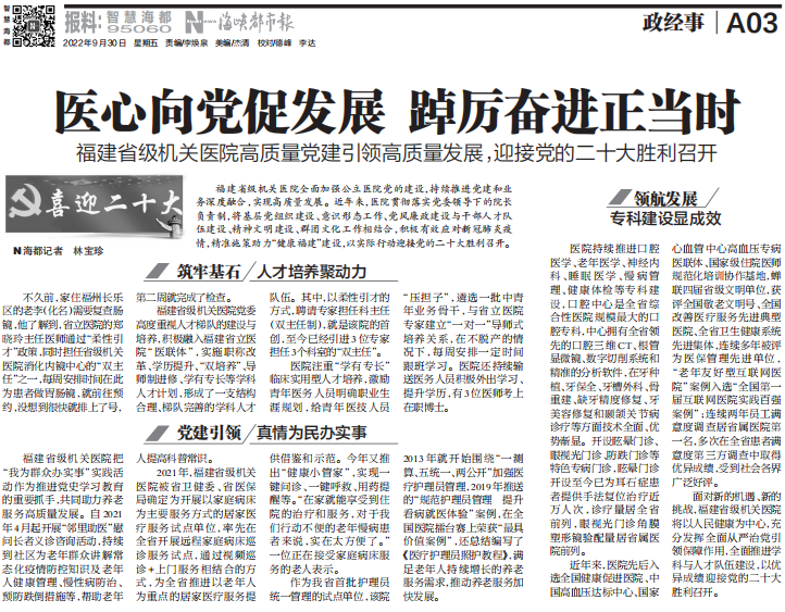 开设省内第一家防跌特色门诊、“双心”门诊,近视防控专科门诊等;完成内镜中心和消化病房一体化改造;承办“福建省老年保健新进展学习班暨国产自拍av 神经病学——睡眠医学学术论坛”;总结编辑、出版《医疗护理员照护教程》。