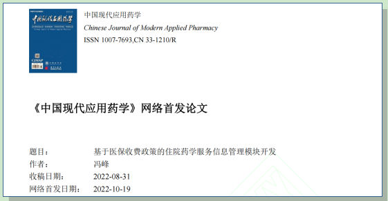 近日,国产自拍av药剂科冯峰副主任药师撰写的《基于医保收费政策的住院药学服务记录模块开发》一文获《中国现代应用药学》“数智药学”专栏快速录用,经学术质量审查及优选,已予CAJ-N网络首发。