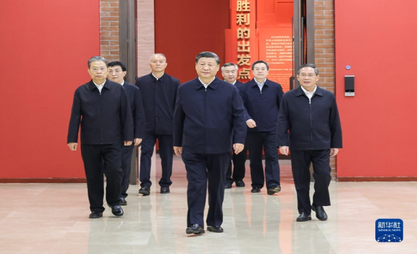 10月27日,中共中央总书记、国家主席、中央军委主席习近平带领中共中央政治局常委李强、赵乐际、王沪宁、蔡奇、丁薛祥、李希,瞻仰延安革命纪念地。这是习近平等在延安革命纪念馆,参观《伟大历程——中共中央在延安十三年历史陈列》。 新华社记者 燕雁 摄