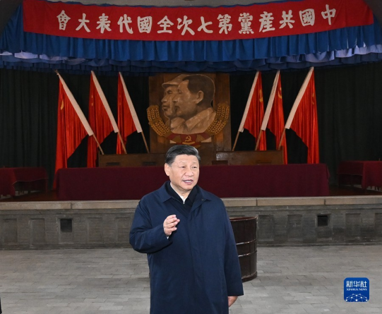 10月27日,中共中央总书记、国家主席、中央军委主席习近平带领中共中央政治局常委李强、赵乐际、王沪宁、蔡奇、丁薛祥、李希,瞻仰延安革命纪念地。这是习近平在杨家岭瞻仰中共七大会址。 新华社记者 燕雁 摄