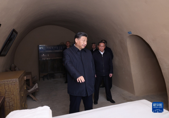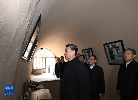 10月27日,中共中央总书记、国家主席、中央军委主席习近平带领中共中央政治局常委李强、赵乐际、王沪宁、蔡奇、丁薛祥、李希,瞻仰延安革命纪念地。这是习近平等在杨家岭参观朱德旧居。 新华社记者 燕雁 摄