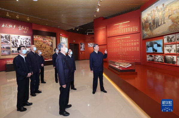 从1935年到1948年,以延安为中心的陕甘宁边区是中共中央所在地,是中国人民抗日战争的政治指导中心和中国人民解放斗争的总后方。展览全面系统展示了党中央和毛泽东等老一辈革命家把马克思主义基本原理同中国革命具体实践相结合、在延安领导全国革命走向胜利的光辉历史。习近平等依次参观了“中共中央和红军长征的落脚点”“中国人民抗日战争的政治指导中心”“创建新民主主义的模范试验区”“夺取全国胜利的出发点”“延安精神永放光芒”等展览内容。习近平不时驻足观看,同大家一起缅怀党中央在延安时期的峥嵘岁月。