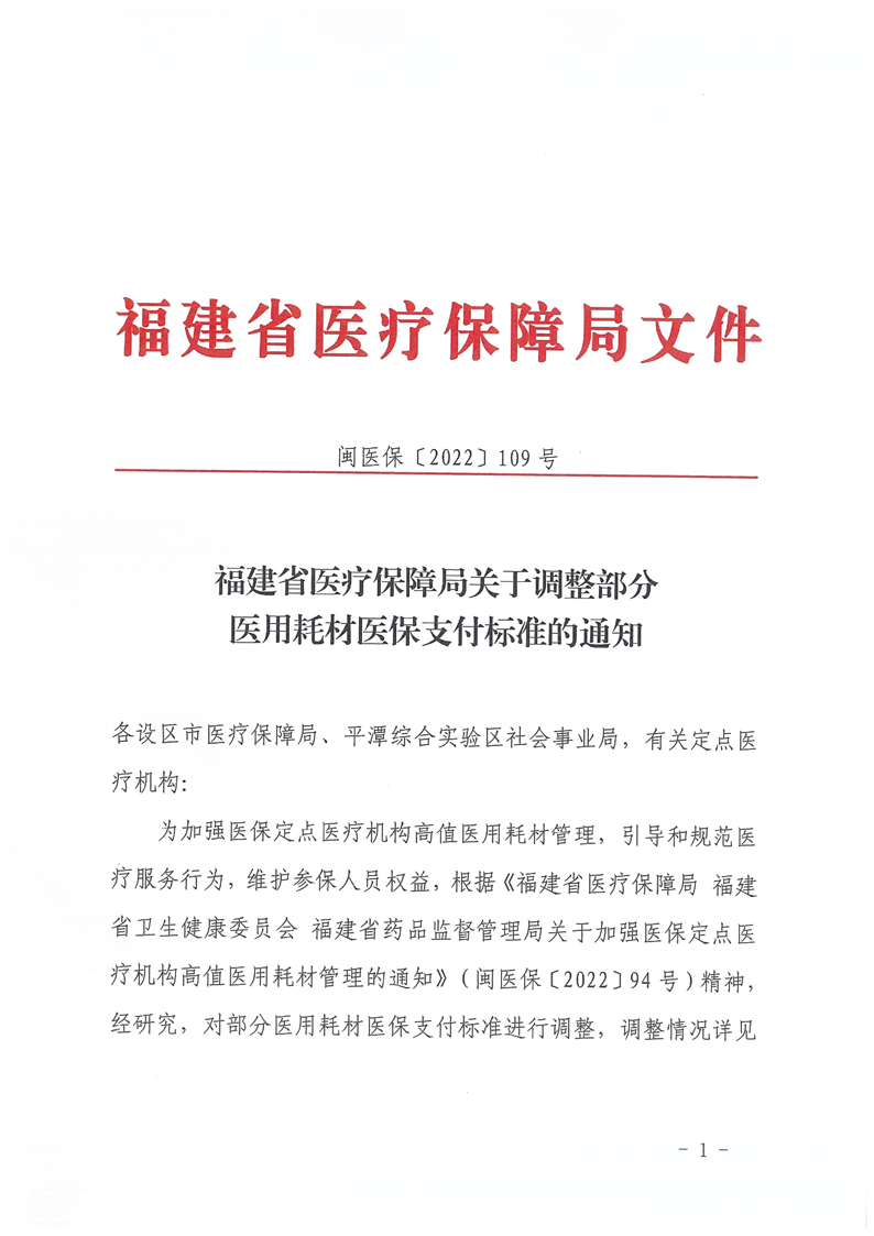 福建省医疗保障局关于调整部分医用耗材医保支付标准的通知
