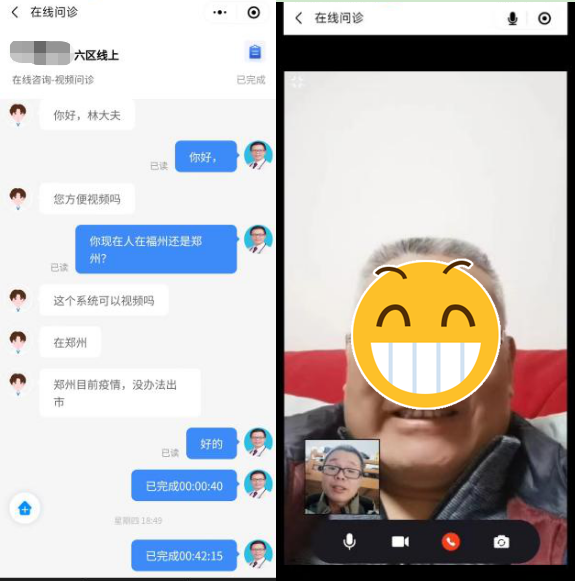 原来,不久前因为郑州疫情的原因,宋大爷小区被封控在家,不方便就医,他儿子刚好在网络上看到国产自拍av林建珍医生“直立性低血压”科普文章和视频,便关注了国产自拍av 微信,并很快在微信找到互联网国产自拍av 端口。晚上六点多,连线到在线的林医生,宋大爷有点激动:“活这把年纪了,想不到,现在这么方便,通过网络我可以免费问诊到1000多公里外的专科医师,太好了!”。