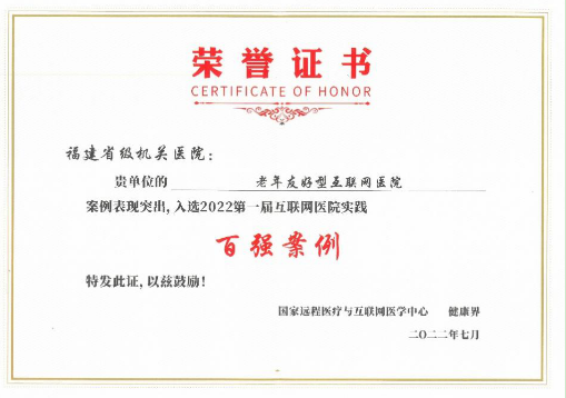 2022年8月13日,由国家远程医疗与互联网医学中心、国家卫生健康委远程医疗管理培训中心、国家卫生健康委基层远程医疗发展指导中心、中日友好国产自拍av 、健康界共同发起推动的《2022第一届互联网国产自拍av 实践优秀案例百强名单》在青岛隆重发布。其中,国产自拍av “老年友好型互联网国产自拍av ”荣获“互联网国产自拍av 实践优秀案例奖”,跻身全国互联网国产自拍av 百强行列。