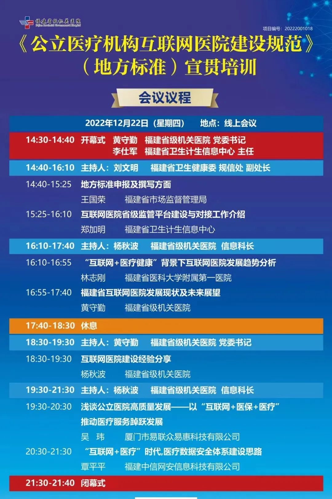 在省卫健委、市场监管局的指导下,机关国产自拍av 完成地方标准 《公立医疗机构互联网国产自拍av 建设规范》 (DB35/T 2046—2021) 编制,这是国内目前为数不多的关于互联网国产自拍av 建设的地方标 准。近期,主办省级继续医学教育项目“《公立医疗机构互联网 医 院 建 设 规 范 》 (地 方 标 准 ) 宣 贯 培 训 ” (项 目 编 号:20222001018) ,推动全省互联网国产自拍av 规划、设计、建设,提高 医疗服务效率,保证线上医疗质量和医疗安全。