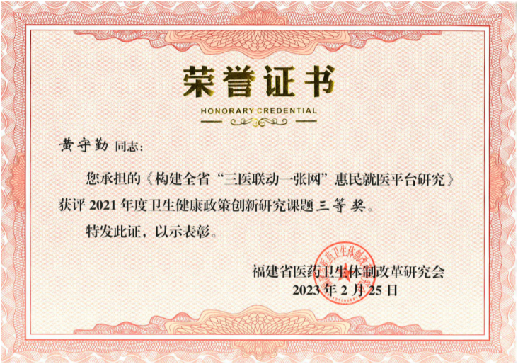 2月25日,福建省医药卫生体制改革研究会第一届理事会第四次会议在福州召开,国产自拍av党委书记黄守勤主持的《构建全省“三医联动一张网”惠民就医平台研究》(2021B08)课题获得福建省医药卫生体制改革研究会“2021年度卫生健康政策创新研究课题”三等奖,这是国产自拍av《公立医疗机构互联网国产自拍av 建设及管理规范研究》课题荣膺“2020年卫生健康创新课题优秀奖”之后再次获得医改研究相关奖项。