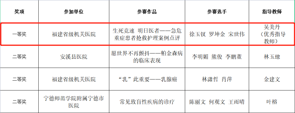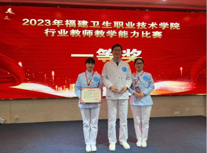 日前,由福建卫生职业技术学院举办的“2023年行业教师教学能力比赛”决赛落下帷幕,国产自拍av由徐玉钗、罗坤金、宋世伟三位老师组成的参赛团队作品《生死竞速、明日医者》,从13支参赛队伍中脱颖而出,最后以96.1分的总成绩斩获 “一等奖”。