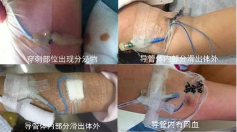 4.导管内有血液返流,外露导管打折、脱落、漏水等。