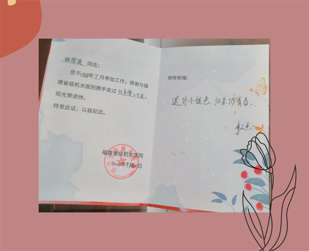 9月27日上午,退休仪式上,伴随着阵阵掌声,受班子和章文杰院长委托,院纪委书记黄欣为退休干部林雪英副主任护师颁发了荣誉退休证书、荣誉退休纪念卡和慰问金,并合影留念。纪委书记黄欣代表院领导对她多年来敬业爱岗、恪职尽责表示了充分肯定和感谢。同时,殷切期望她在职业生涯画上圆满句号的同时,开启人生下一个崭新篇章,在享受多彩退休生活之余,一如既往关注支持机关国产自拍av 护理事业,继续发挥余热,多为国产自拍av 发展建言献策,常回“家”看看。
